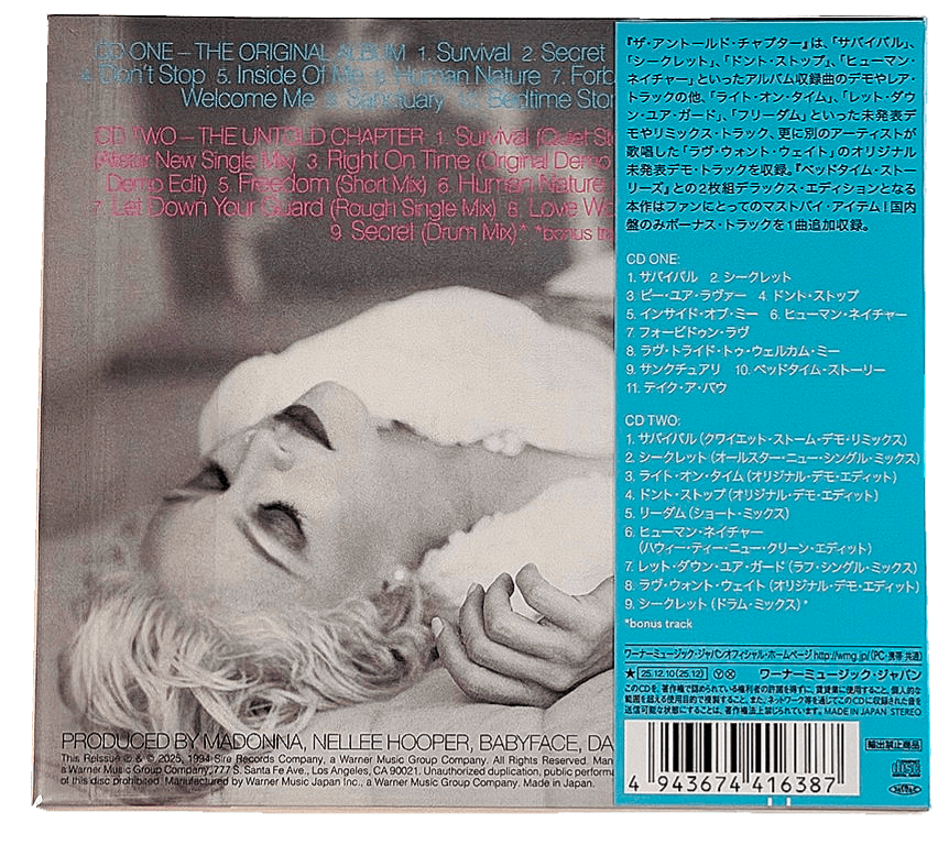 Official 2025 Japanese 30th Anniversary deluxe edition 19 track double album 2-cd set of 'Bedtime Stories' pairing the original album from 1994 on cd1 with a bonus disc titled "The Untold Chapter" on cd2 & featuring early demos, alternative versions & rarities from the albums recording sessions edited & mixed by Stuart Price.