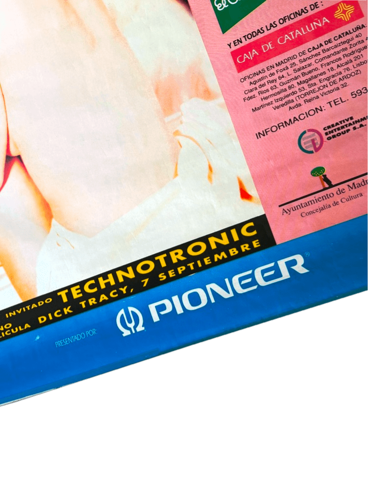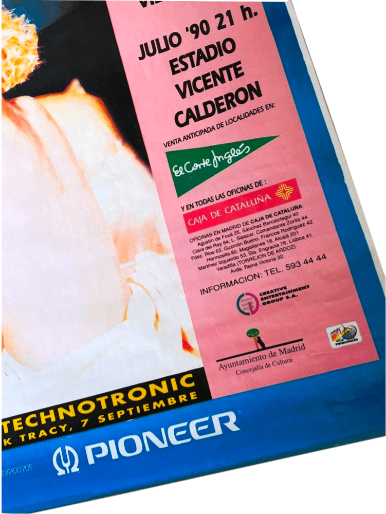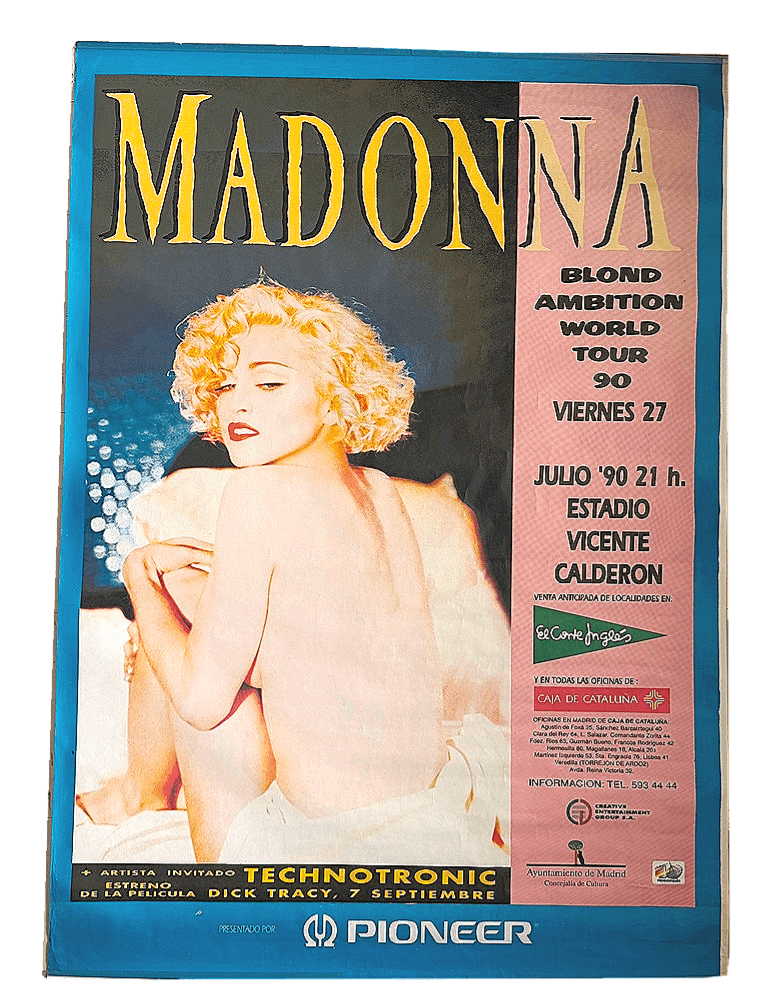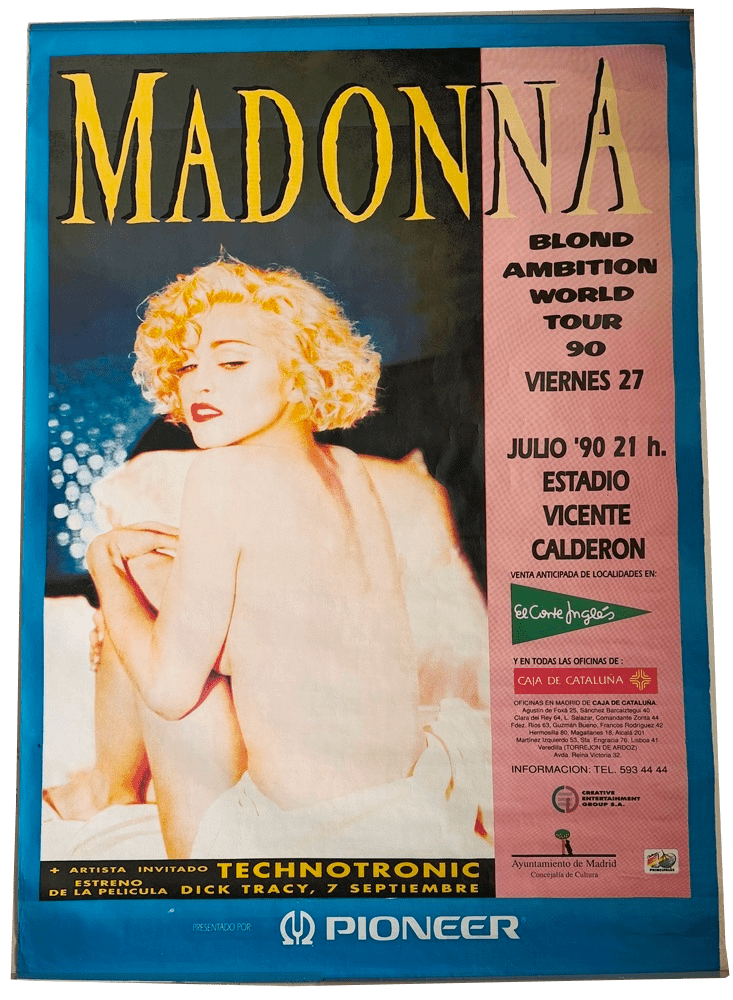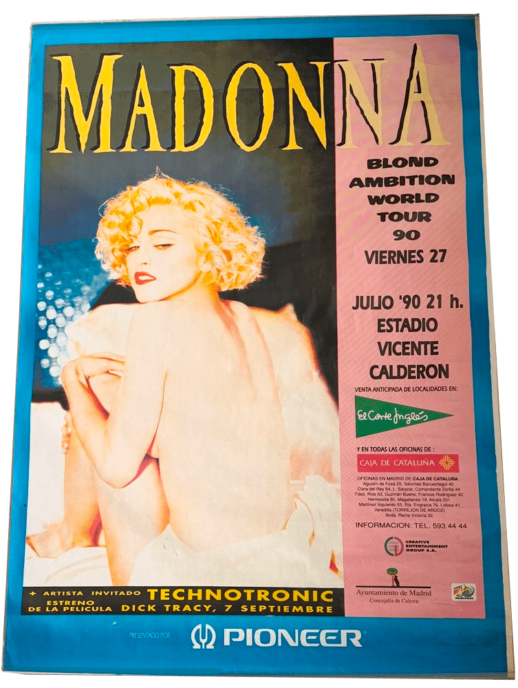 Giant bus shelter size 'Blond Ambition Tour' advertising promo poster featuring the iconic "Express Yourself" video image used to promote the 1990 Madonna tour, measuring a massive 54" x 39" and at over 4.5ft used for subway or bus shelters. Exclusive to the Madrid region with Spanish text, Sponsorship and venue info for the "Friday 27th July 1990" concert at "Vicente Calderon Stadium" sponsored by "Pioneer".