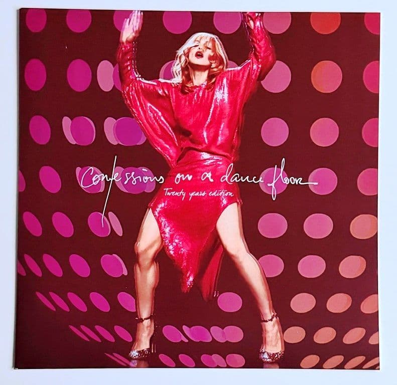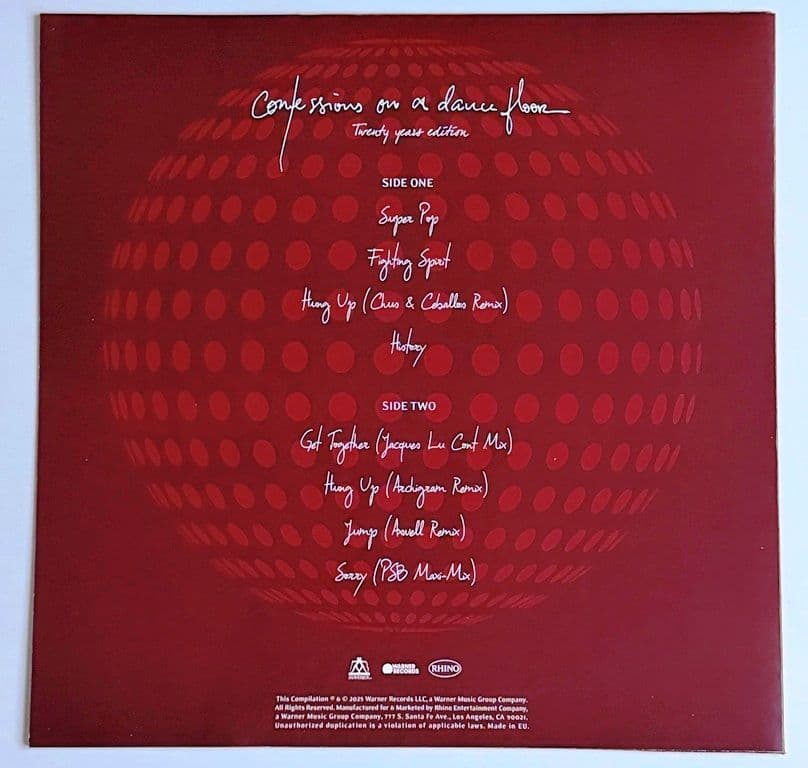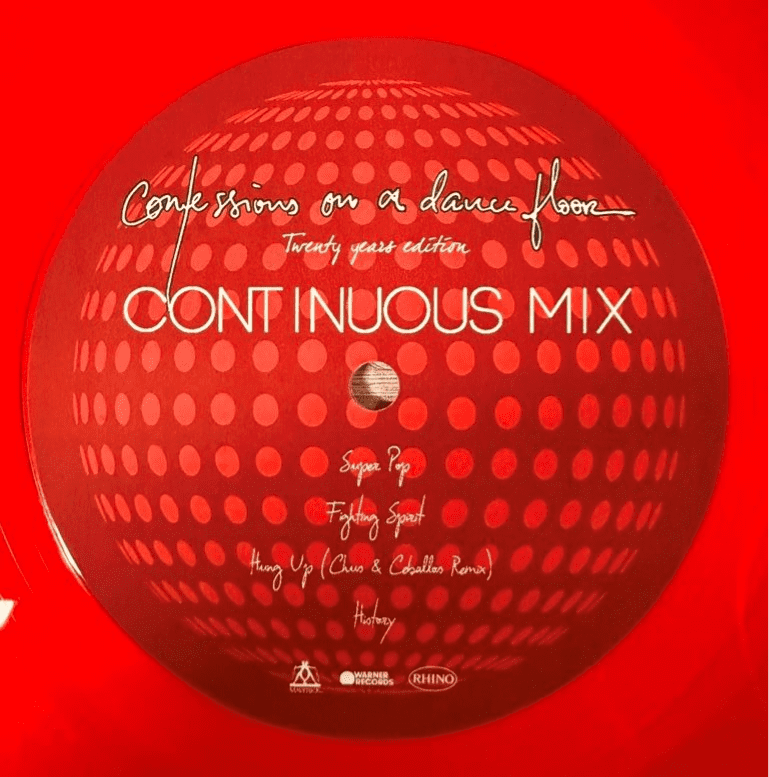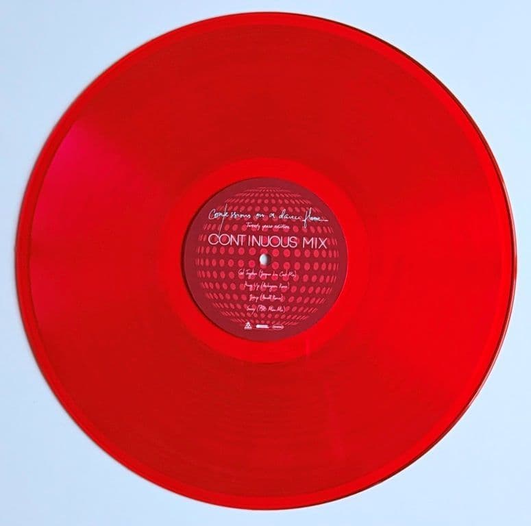 Limited Edition custom made 12" red colour vinyl housed inside a picture sleeve with printed labels, featuring a Continuous mix of 8 tracks from the 20 Year Edition of "Confessions on a Dance Floor" (never commercially released on vinyl or cd format) -