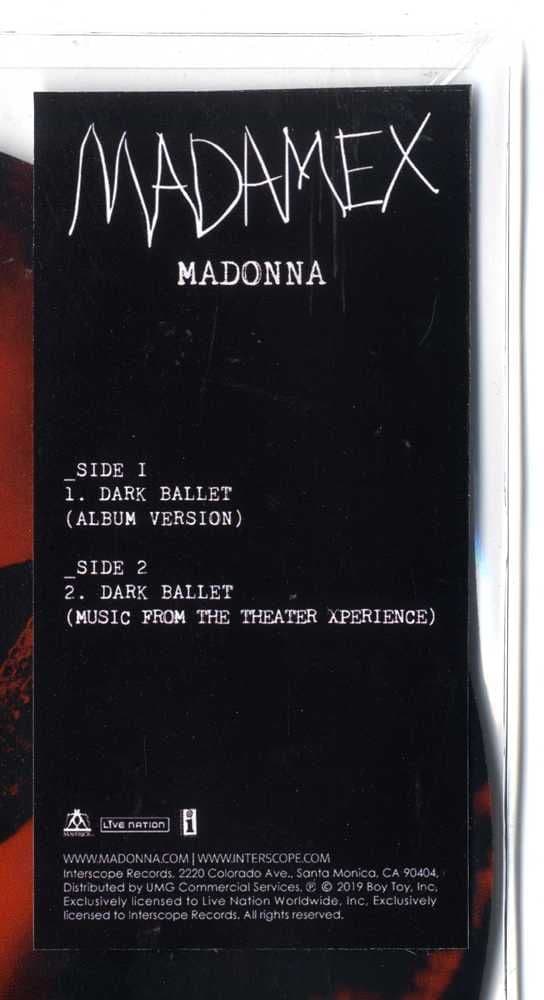 Limited Edition "Dark Ballet" custom made 7" picture disc from the "Madame X Collection" housed inside a stickered clear sleeve, featuring a two remixes of the Madonna track from the 'Madame X' album -