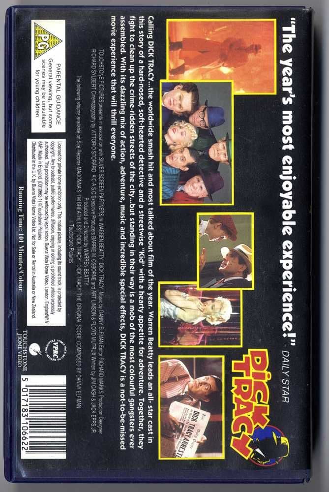 Original UK VHS PAL video release for the Film 'Dick Tracy', Warren Beatty leads the all-star cast including Madonna & Al Pacino in the story of a hard-nosed, soft hearted detective and a street wise kid with a Hearty Appetite for adventure. Total running time 101 minutes.