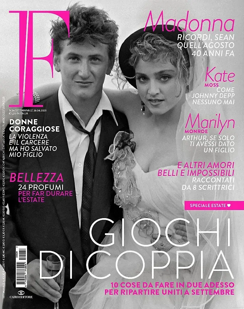 Madonna & Sean Penn feature on the full cover with a archival cover photo celebrating 40 years since the infamous wedding way back in August 1985. Inside there is also a 4 page feature on the celebrity couple with numerous photos from the late eighties. Issued in Italy dated "26th August 2025' & titled 'F' Issue no. 34 with Italian text throughout.