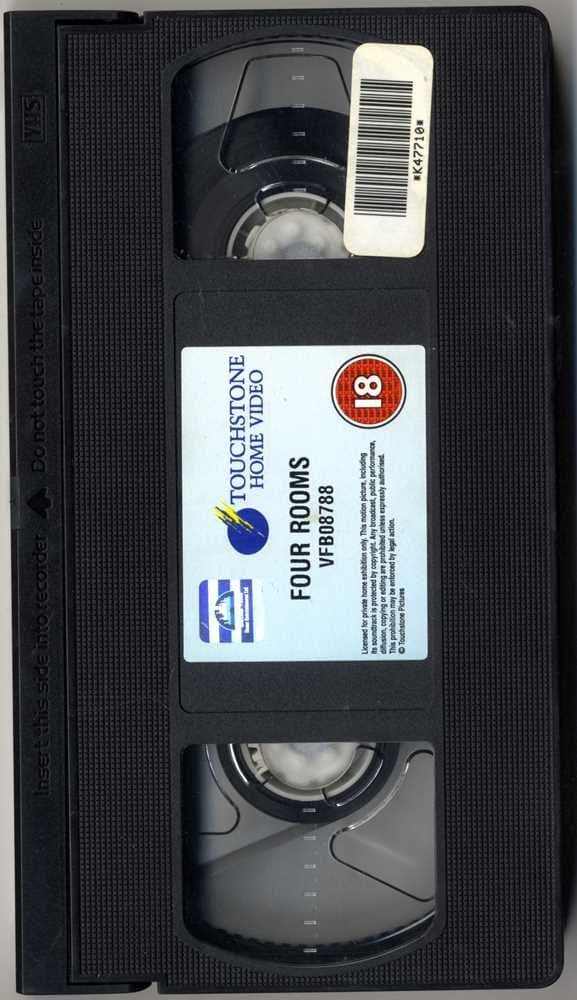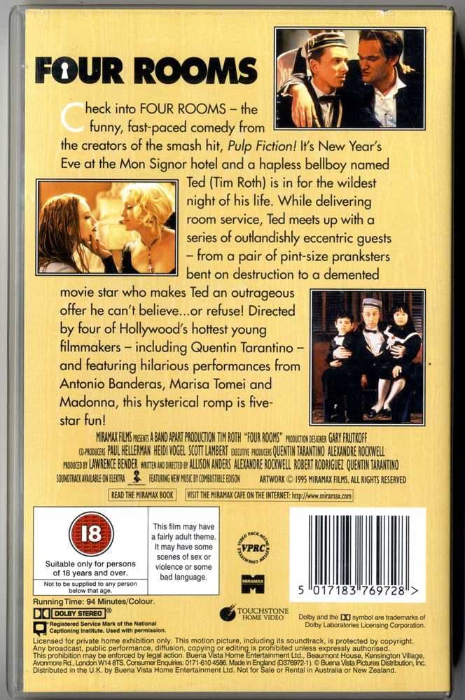 Original 1992 UK PAL/VHS video cassette release for the Film 'Four Rooms' the funny, fast paced comedy with 4 sections directed by four of Hollywood's hottest young filmmakers including Quentin Tarontino and featuring hilarious performances from Madonna, Antonio Banderas & Marisa Tomei, Total running time 94 minutes.