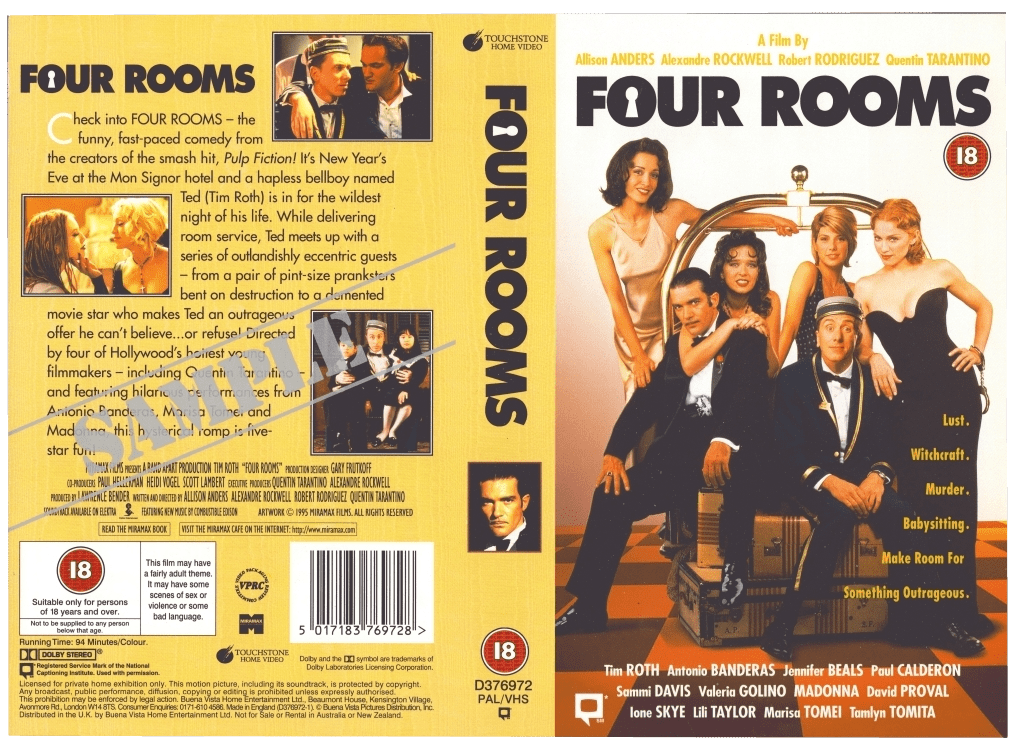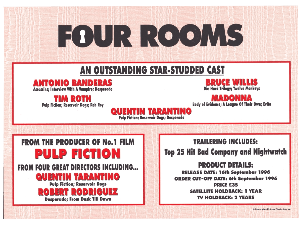 Official 1996 UK promotional glossy VHS Video info / sample sales flyer issued to video stores to assist in the promotion ot the VHS Rental release of "Four Rooms". A glossy colour A4 sheet with the video picture sleeve on one side (note the SAMPLE text and there are no crease lines like a normal video picture sleeve), with release and promotional info for the video shop on the back confirming the release & film info.
