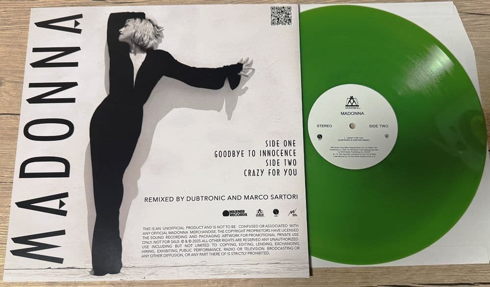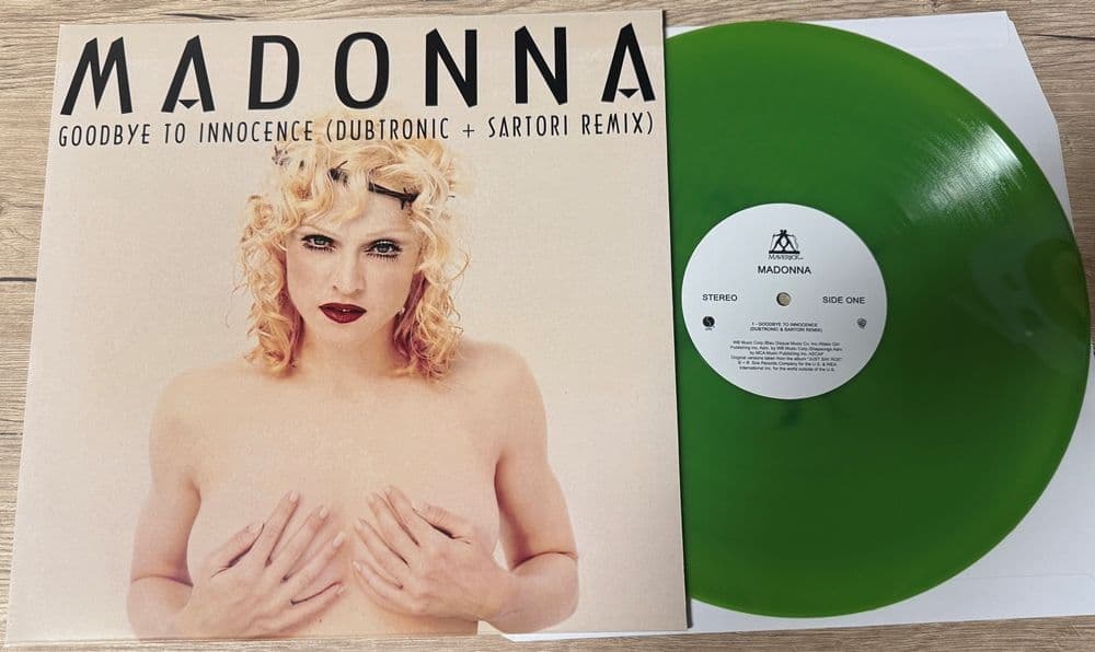 MADONNA - GOODBYE TO INNOCENCE (REMIXES) - 12" LIME GREEN COLOUR VINYL Limited Edition 'Goodbye to Innocence' Dubtronic & Sartori remixes 12" lime green colour vinyl housed inside a picture sleeve with printed labels & featuring mixes of charity only released album track (from the Just say Roe compilation) -