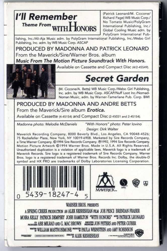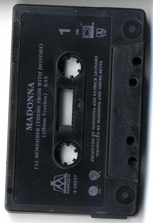 MADONNA - I'LL REMEMBER USA CASSETTE SINGLE 4-18247Original 1994 USA cassette maxi single featuring two tracks including 'I'll Remember' (Theme From With Honors), housed in a card sleeve 'Rain' video picture slip case -