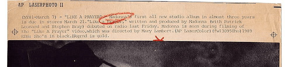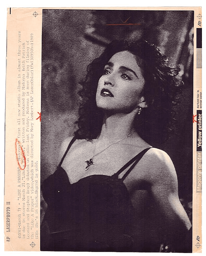 Original 1989 10" x 8" black & white promotional publicity press laser photo issued to a US newspaper for print reporting on the 'Like a Prayer' album release, featuring a Madonna photo video still from the video , with info text which reads "AP LASERPHOTO II (NY81-March 7) - "LIKE A PRAYER" - Madonna's first all new studio album in almost three years is due in stores March 21. "Like a Prayer," written and produced by Madonna (with Patrick Leonard and Stephen Bray) debuted on radio last Friday. Madonna is seen during filming of the "Like a Prayer" video, which was directed by Mary Lambert. (AP Laserphoto) (fwl30950ho) 1989 EDS: She's in black. Bkgrnd is gold." Printed as a Laser photo on thin glossy newspaper style paper.