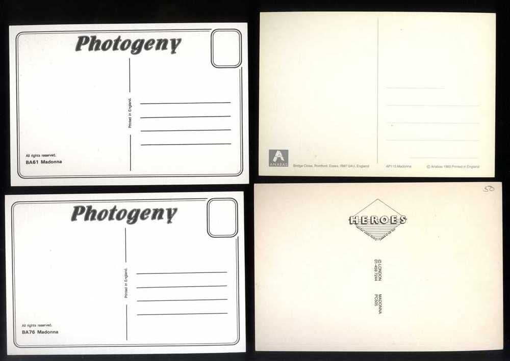 MADONNA - SET OF 4 EIGHTIES VIRGIN ERA POSTCARDS A set of four different Madonna postcards / photo cards measuring approximately 7" x 5" with different 80's Virgin era images which were mainly issued in the UK (some from Europe). Most cards have the company makers or catalogue number on the back as well as the markings of a general postcard.