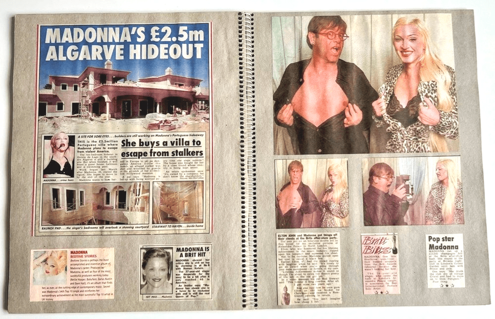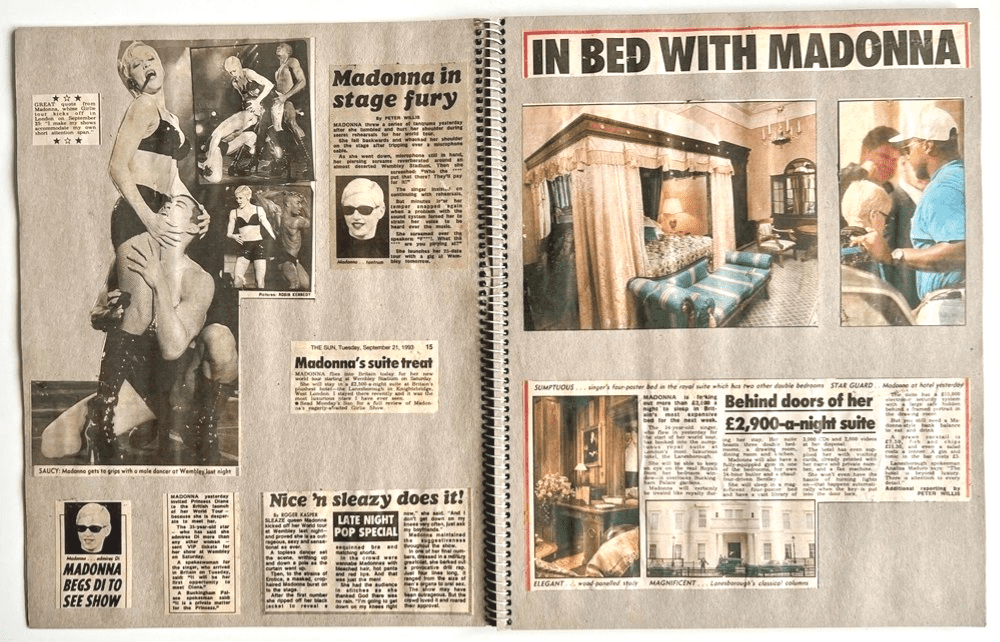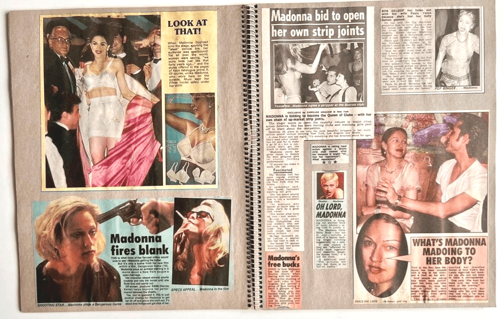 A unique 40 page fan made scrapbook consisting of 100+ Madonna press cuttings, articles & photos carefully compiled & housed inside an original scrap book with different clippings taken from the mostly UK newspapers from a period which appear to be from late 1991 through the Sex, Erotica, Girlie Show, & Bedtime Story Period through to early 1995.