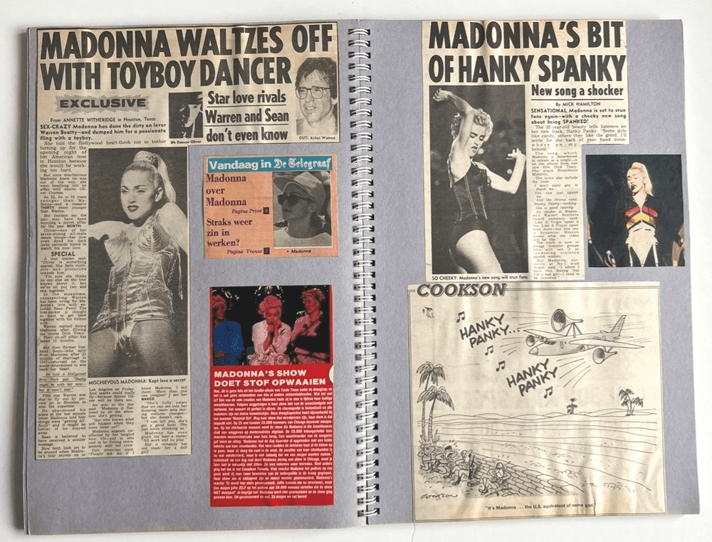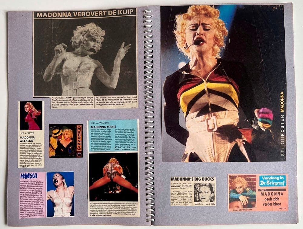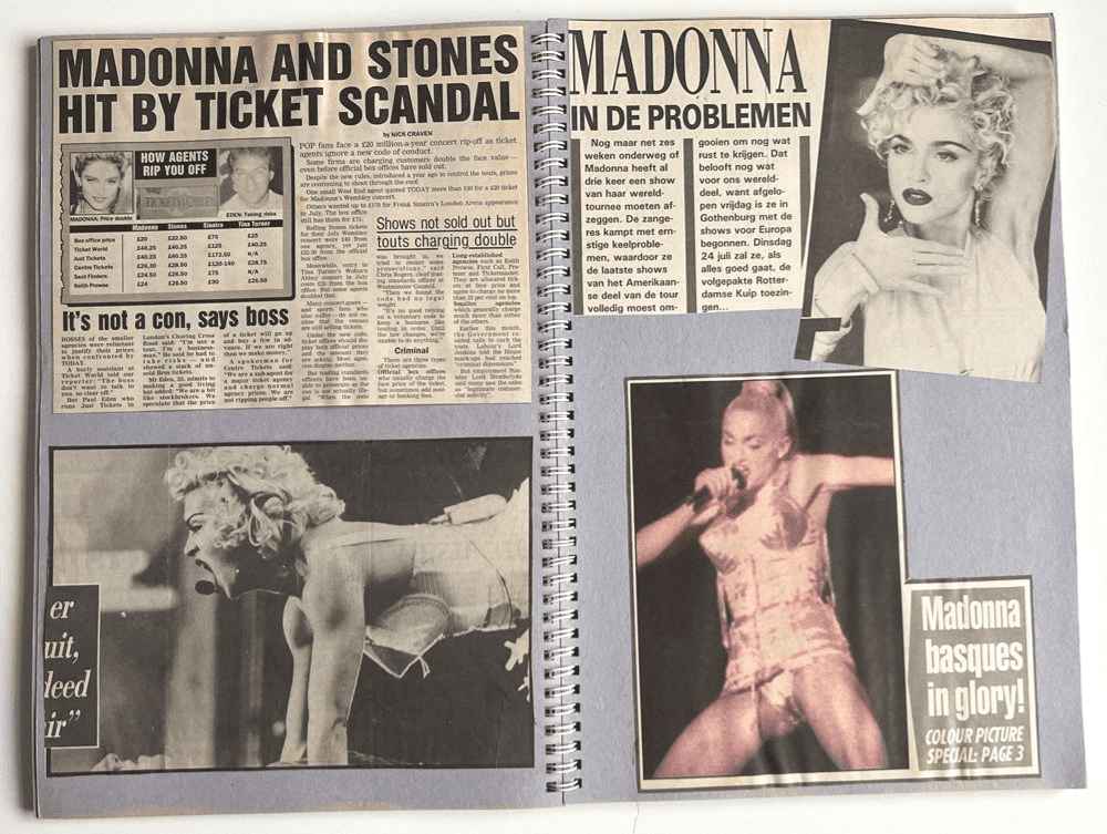 A unique 60 page fan made scrapbook consisting of 100's of Madonna press cuttings, articles & photos carefully compiled & housed inside an original scrap book with different clippings taken from the UK newspapers and also a selection from press in the Netherlands, all appear to be from a period from 1989 to 1991 with the majority reporting in "The Blond Ambition Tour"