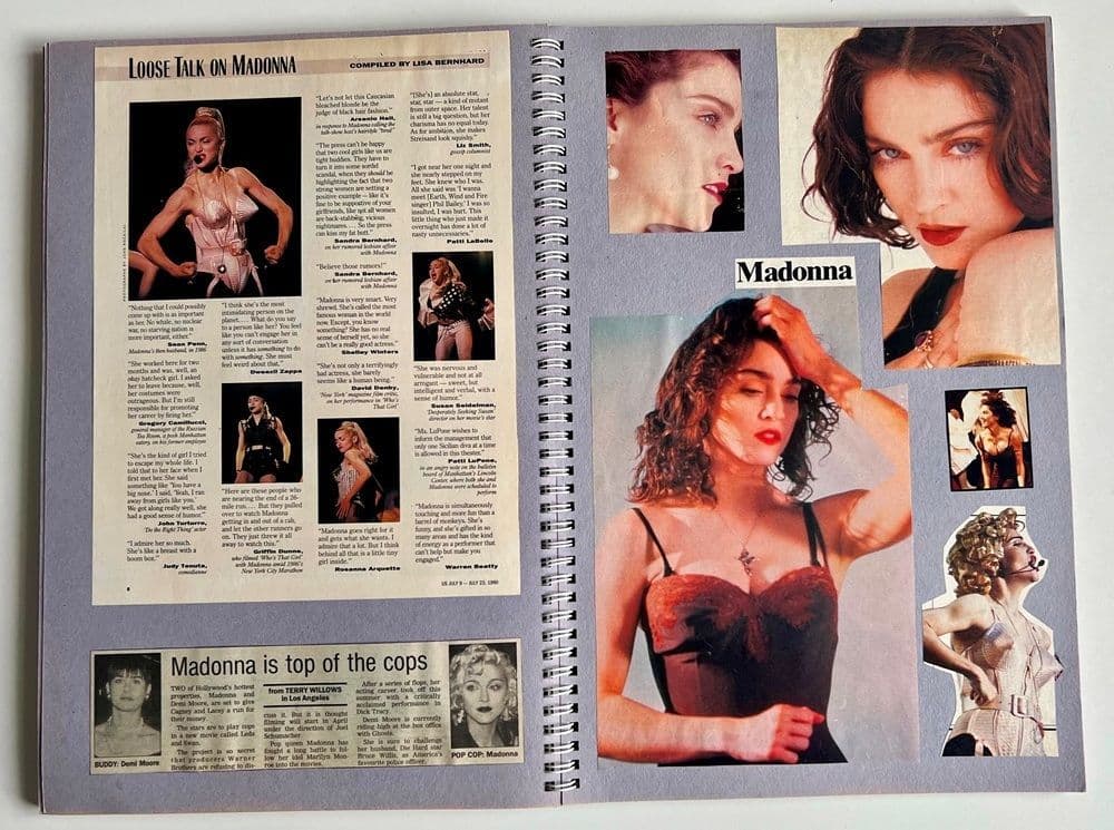 Madonna press cuttings & images complete each page with the spiral bound book measuring approximately 14" x 10" , a selection of pages are photographed for you to have an idea of the content. All images are now glued inside.