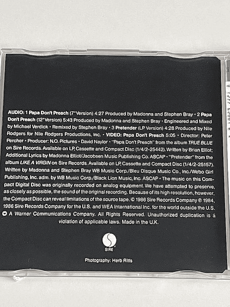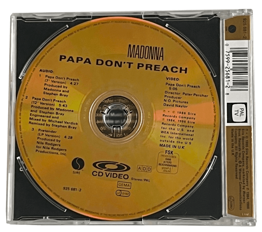 MADONNA - PAPA DON'T PREACH UK GOLD DISC CD VIDEO SINGLEOfficial 1986 UK Gold Disc Cd Video single 'Papa Don't Preach' Issued in a maxi jewel case with picture insert & featuring 3 audio tracks and the official video -