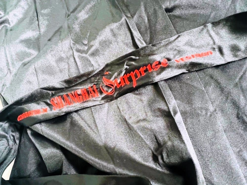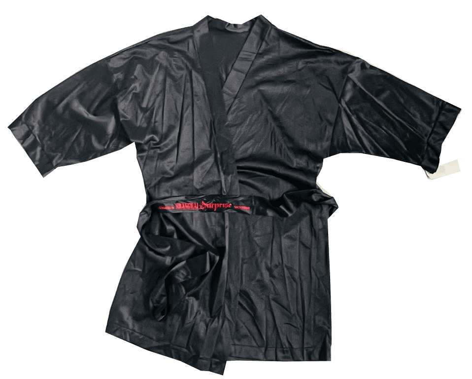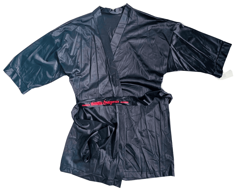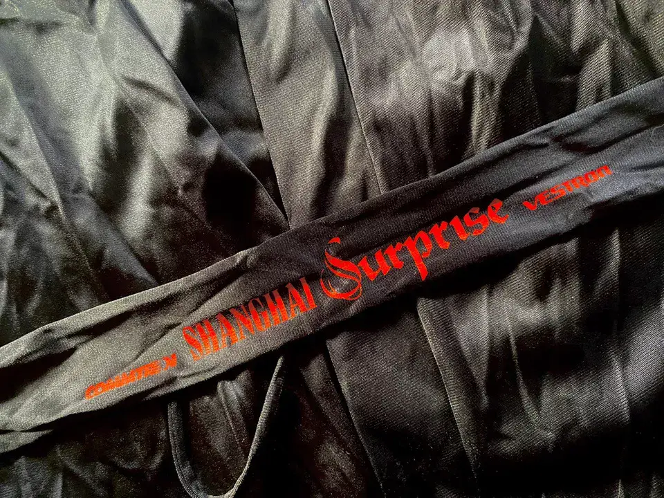 Official 1986 USA promotional 'Shanghai Surprise' merchandise produced to promote the movie release starring Madonna & Sean Penn. A black shiny sating style bath robe complete with waist tie (belt) featuring red printed text and a 'Vectron' logo. Issued in limited quantities to assist in the promotion of the video release and never commercially available for sale.