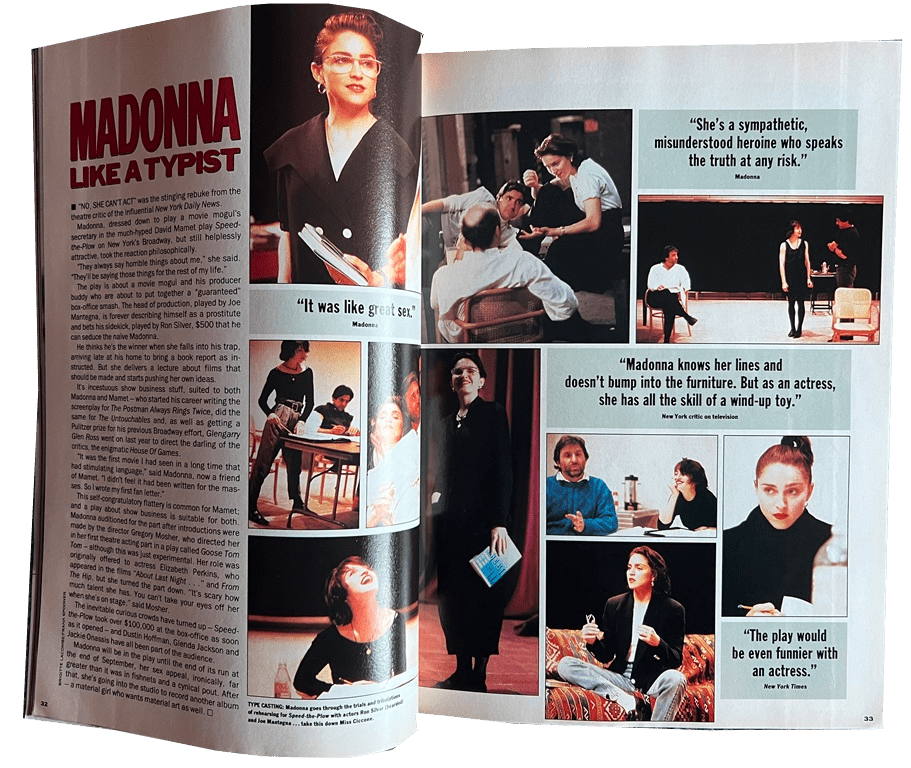 MADONNA - SKY MAGAZINE UK EDITION JULY 1988Madonna features inside the UK Entertainment Magazine 'SKY' dated 'July 1988' with a scarce write-up, review & photos from the broadway play 'Speed the Plow' ' with numerous seldomly seen rehearsal photos over a 4 page feature inside,