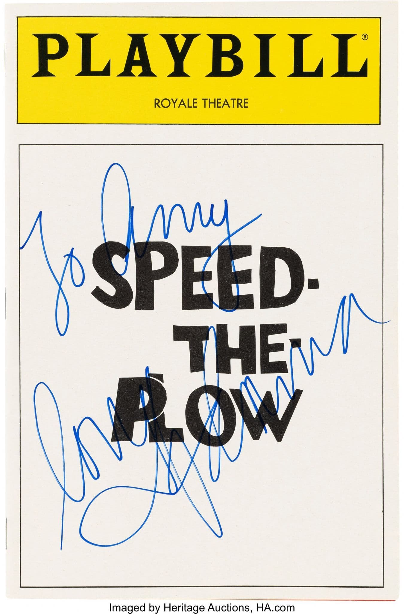 Madonna Autographed Speed-the-Plow Playbill, Royale Theatre, New York (ca. July 1988). Original 66-page program from David Mamet's play Speed-the-Plow, performed at the Royale Theatre for a few weeks only and featuring Joe Mantegna, Ron Silver, and Madonna in the pop star and actress's West End debut as Karen. The front cover is boldly inscribed in blue ink by Madonna, reading: "To Amy / love Madonna," signed across the show title. A rare and personal piece from the pop icon's early stage career.