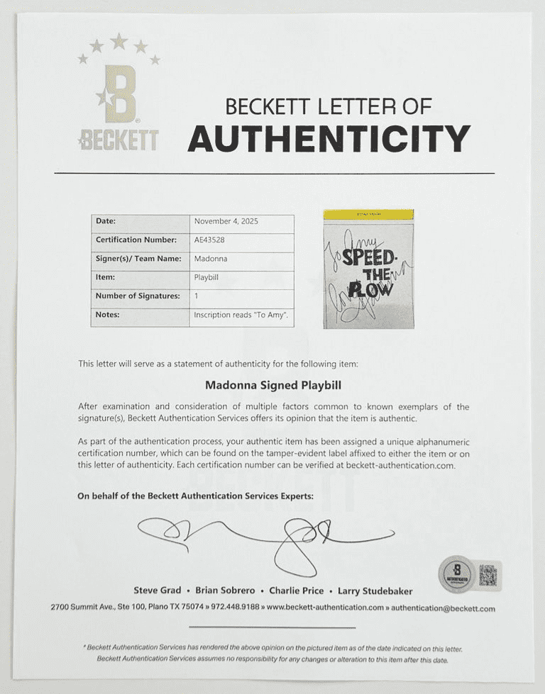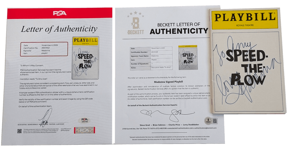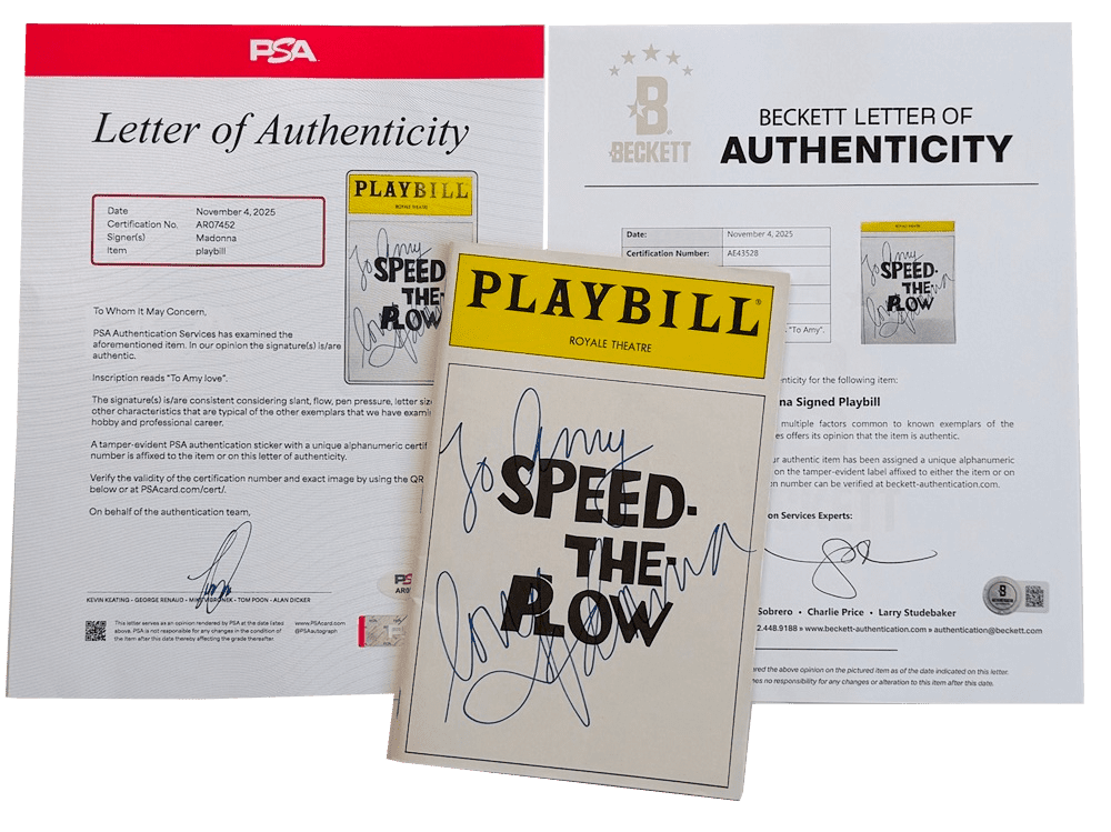 A scarce theatre playbill featuring a photo of "Madonna, Ron Silver & Joe Magenta" inside measures approximately 8.5" x 5.5". A unique item personally signed by Madonna 37+ years ago, comes with provenance authenticated by the well renowned 'Beckett' authentication service (BAS) & also "PSA" authentication services & includes two Letters of Authenticity which are both numbered & watermarked. (you can also scan the QR code on the letters / certificates which takes you directly to the authenticated item on both the Beckett & PSA websites which acts as lifelong provenance from two of the most respected companies for authenticating such items)