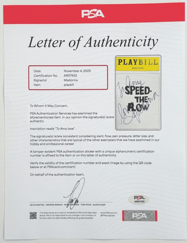 During the short run of the play "Madonna" rarely stopped to sign items when entering / leaving the venue. Each "Letter of Authenticity" state the playbill is signed to "Amy" from Madonna and you can see it could also be "Jenny" as in "Jenny Shimizu" the American model and actress who was part of Madonna's close circle of friends during that period, and was pictured with Madonna, Rosie O'Donnell, and Christopher Ciccone at events related to the play's run.
